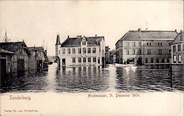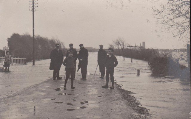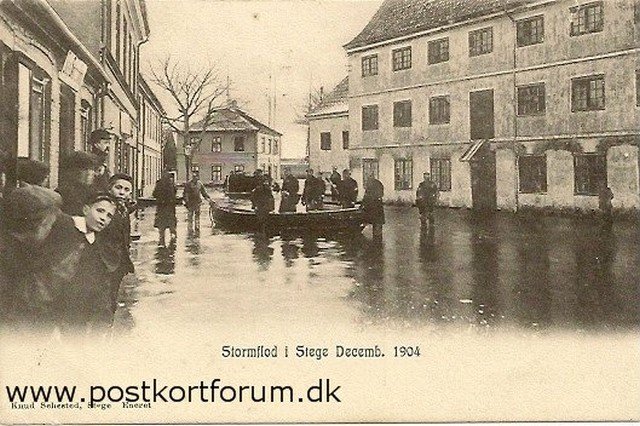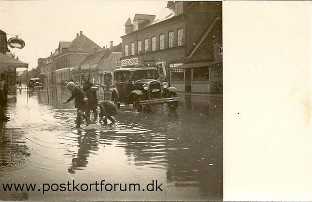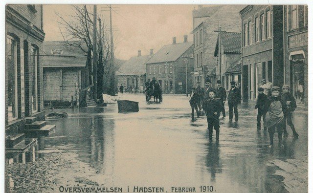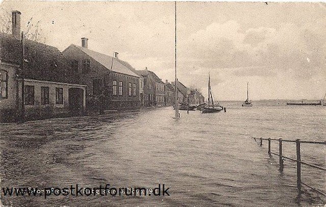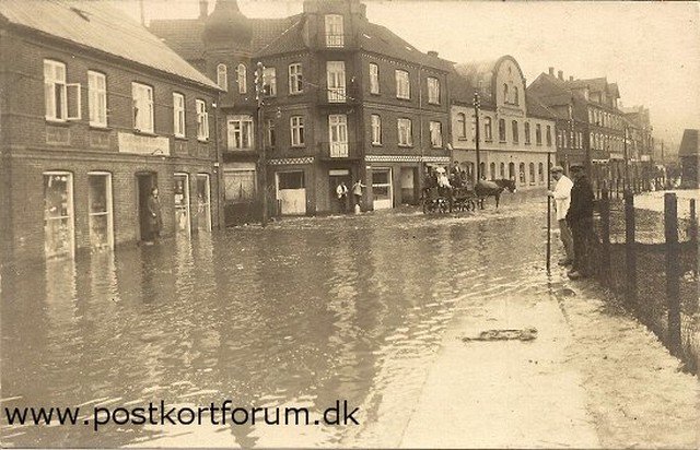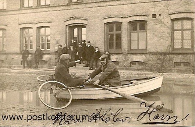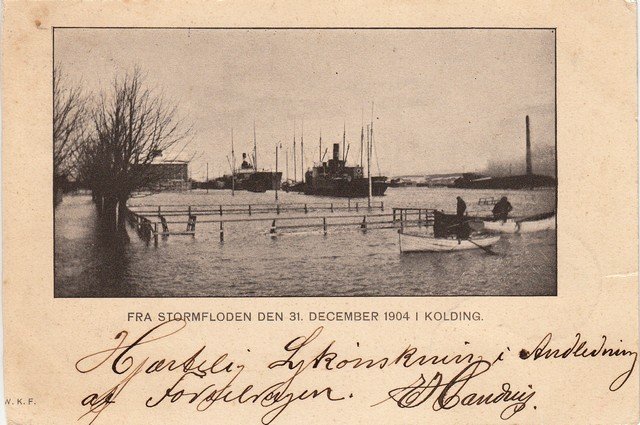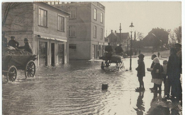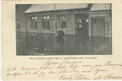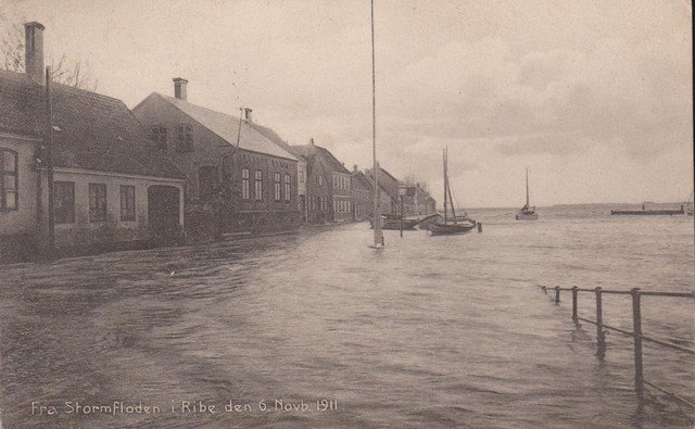 Stormflod Ribe Set fra Plantagen 5 november 1911. Bag på kortet står: Vandet stod på " [...]Grønnevejen" så højt som en voksen mand kunne række. Det stod 2" over komfuret i pavillonen i plantagen. Kortet ejes af Karl H. Andresen