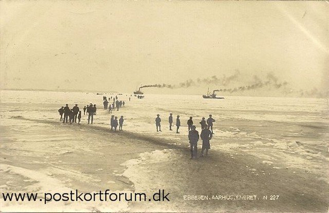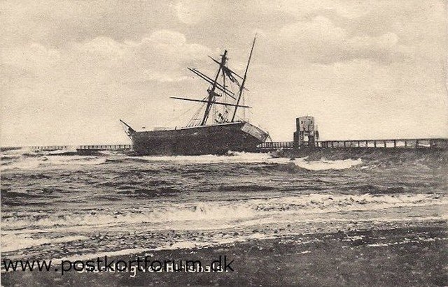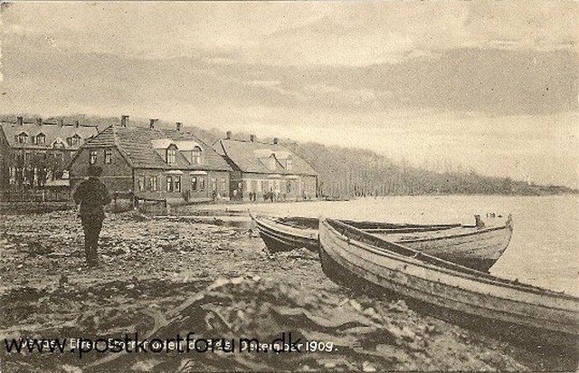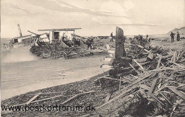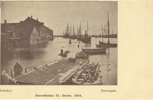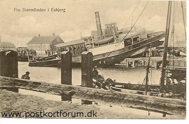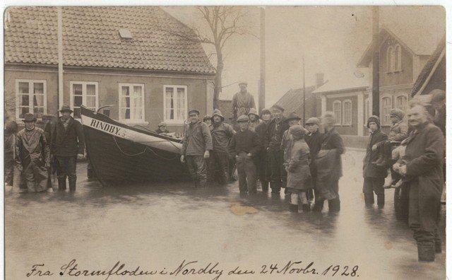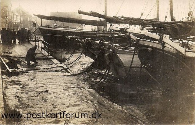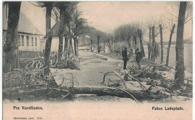 Stormflod i Ribe. Denne "kuf" kom drivende fra Sønderho på Fanø og strandede [...]ved indgangen til "plantagen". Kortet ejes af Karl H. Andresen