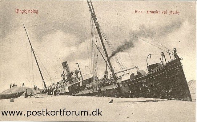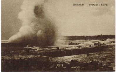 Svaneke i storm. Er poststemplet 15.2.1911 i Åkirkeby. Udgiver H.P.J.A. Kortet ejes [...]af Hans Rubi Klausen