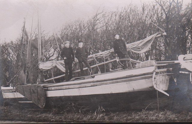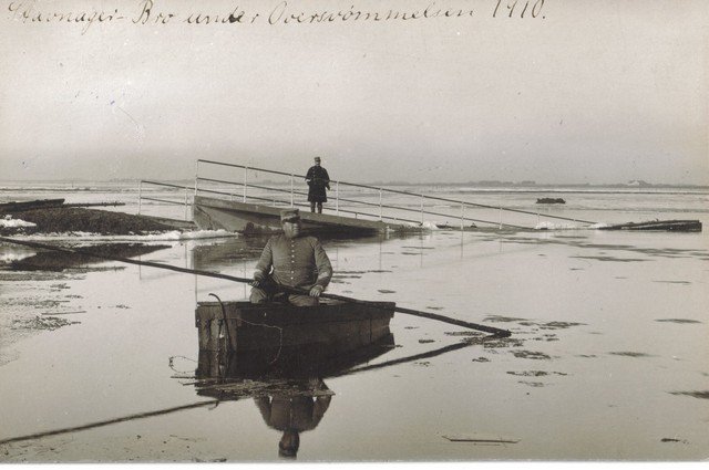 Grænsen Obbekær, Stenager bro 1910 Sergent Rasmus Jørgensen ombord i den selv [...]byggede båd som blev brugt til at færge personer over Gjelså efter stormfloden 3 Dec 1909 hvor vandet skyllede sandet væk omkring Stavnager bro. Kortet ejes af Kennet Pedersen
