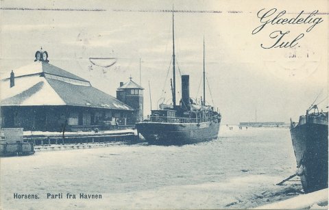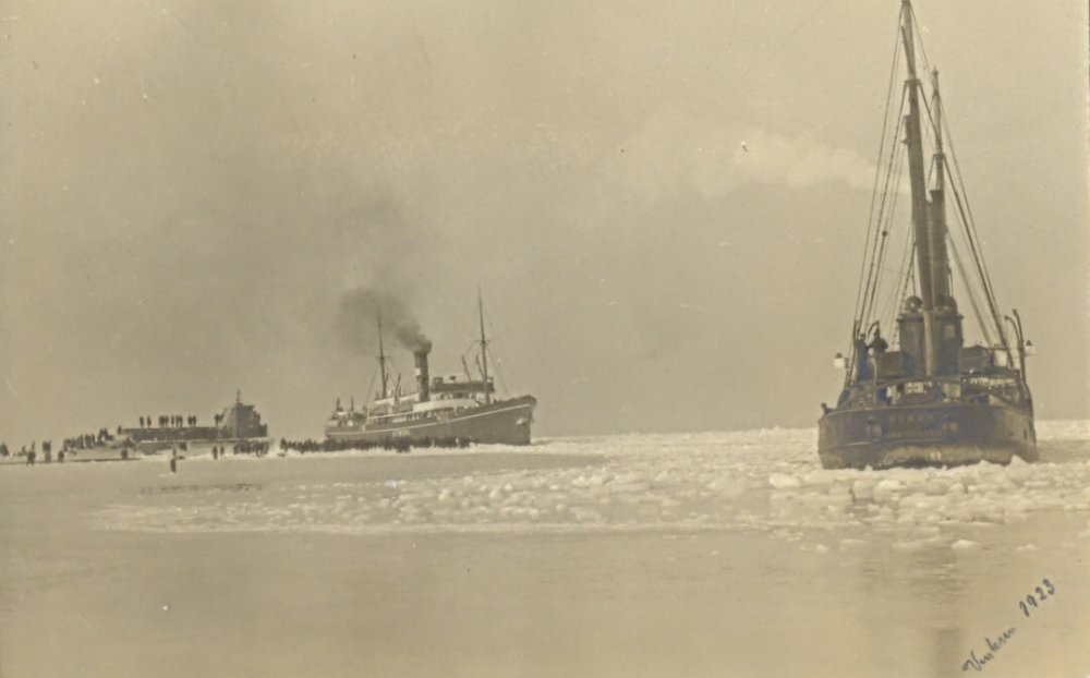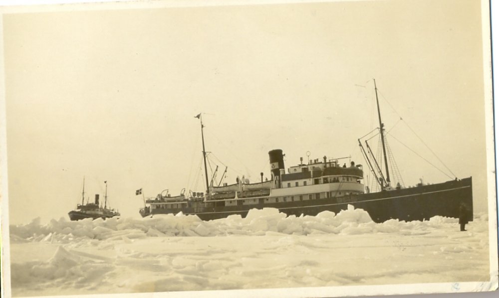 Isvinteren 1929 ud for Rønne. Ægte fotokort. På [...]bagsiden er skrevet: "Ørnen er gaaet ind, og Frem forsøger udefra, men løber sig flere Gange fast og bliver trukket fri af Heimdal. Det gik ikke uden Havari ombord paa begge Dampere, idet isen satte dem sammen. Efter 3 Timers Forløb lykkedes det at komme i Havn og Ørnen gik atter til Ystad."