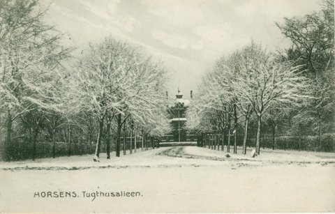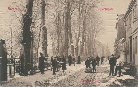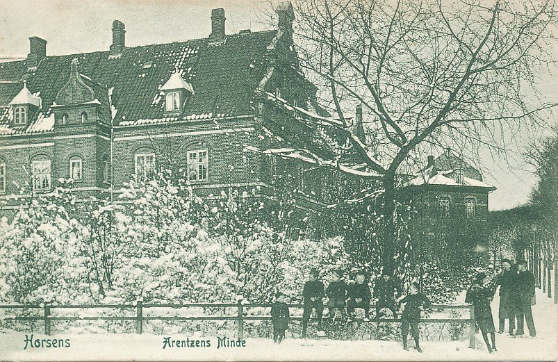 Frank Miller skriver: Horsens. Stjernholmsgade. Arentzens Minde set mod nord. Gasvej anes til hø [...]jre i billedet. Læg mærke til drengene på stakittet. Opført i årene 1895-1896 og arkitekten var Estrup. Bygningen er opført efter tidens mode og en efterligning af ?Rosenborg-stilen?.