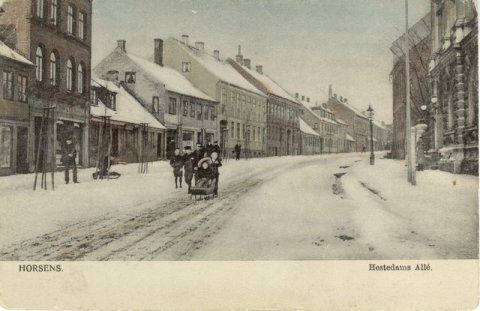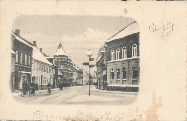 Indsendt af Frank Miller. Horsens. Smedegade set mod nordøst. Hans Lorenzen, Bogbinderi, Papirhandler [...]drev forretning i ejendommen midt på billedet. 1910
