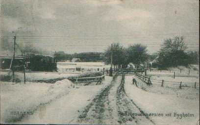 Indsendt af Frank Miller. Horsens. Baneoverkørslen ved Bygholm set mod sydvest og Studentervæ [...]nget. Toget er en af Vestbanernes. 1910