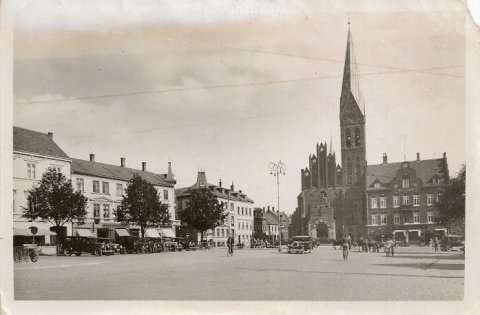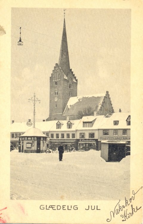 Axeltorv i Nakskov med kirken i baggrunden. Uden år [...]og sendt i konvolut, men vel også ca. 1930. Brevskriveren beklager den korte hilsen, for hun skal hen og pille to gæs.