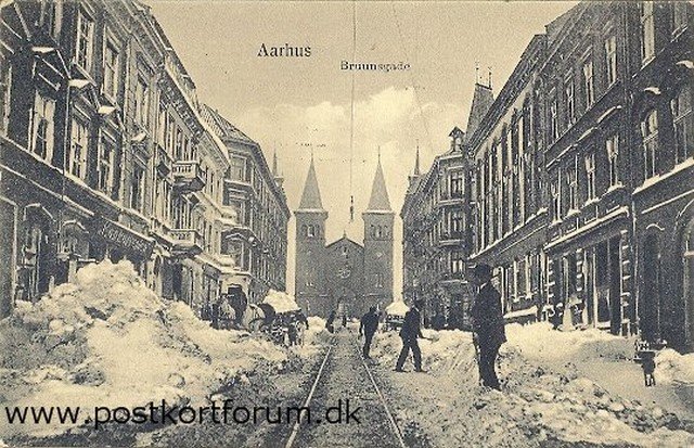 Snestormen jan. 25-26 1910. Store Torv Århus. Til venstre ses det daværende Rådhus [...]og til højre Domkirken. Efter snestormen byggede nogle århusianer en snemand visende en af byens største erhvervsdrivende Hans Borge (1822-1908) Kortet ejes af Torben Hilberg