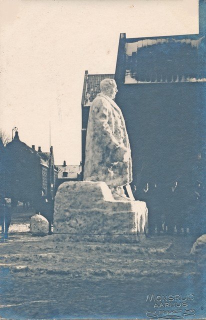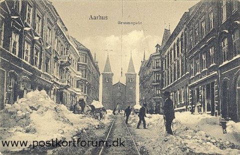 Snestormen jan. 25-26 1910. Store Torv Århus. Til venstre ses det daværende Rådhus [...]og til højre Domkirken. Efter snestormen byggede nogle århusianer en snemand visende en af byens største erhvervsdrivende Hans Borge (1822-1908) Kortet ejes af Torben Hilberg