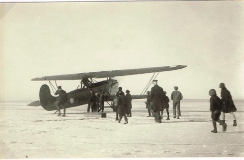 1929. Flyvemaskinen er landet på is ved en dansk ø i vinteren 1929. Folk kommer ilende til [...]mange med huen trukket godt ned. Isen er hård og tyk udfor kysten det har været kold længe, for isen kan bære folk og ikke mindst flyvemaskinen.