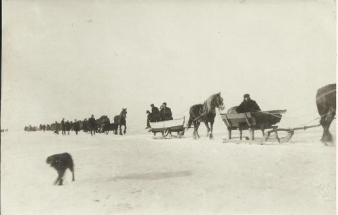 Isvinteren i 1929, og skulle være et foto af slædetransport på vej over [...]isen fra Jylland (Hou) til Samsø. Kortet ejes af Kjeld Albrechtsen
