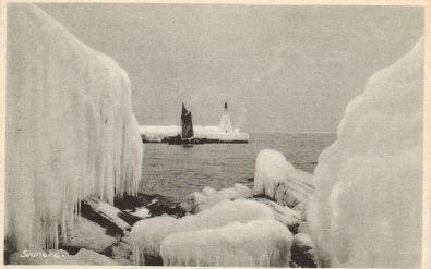 Svaneke i "Istiden". Udgivet af Slengerik Hansens Boghandel i Svaneke. Slengerik Hansen drev boghandel [...]i perioden 1913 - 1949. Når man ser på mængden af is må det være fra isvintrene i 1940erne også når man ser på sejlbådens udseende. Kortet ejes af Hans Rubi Klausen